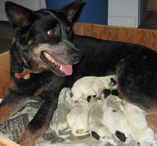 One of my Blue Heelers delivered her first litter of puppies yesterday. It took all day long. The bitch (a female dog, of course) had been staying in the house at night since I feared she might whelp in the dog pen where one of the other females could hurt the puppies. She was up and down all night on Wednesday and I finally gave up and got up to sit with her at 4 AM. It was nearly 3 PM before she delivered her last puppy.