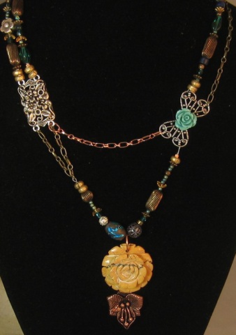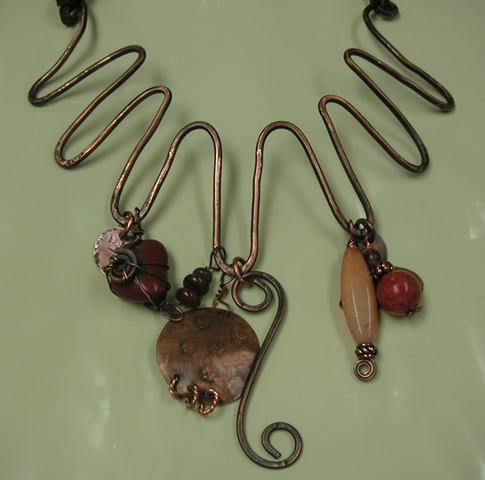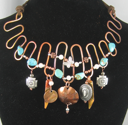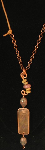 The last photo shows a simple piece derived from thinking “what if?” I just kept adding things to the basic piece of etched copper and ended up with a very long pendant.