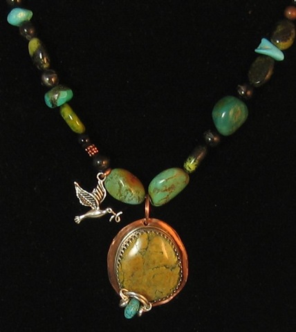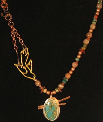 While the next necklace was more complicated, it simply combines processes I already knew. By the way, as we learn in creative thinking training, I used happenstance with regard to the copper “sticks” on the back of the bezel. They were not planned, but when I was trying to torch two straight pieces of copper wire, they fused themselves together. So I went with this mistake and used it in the design.