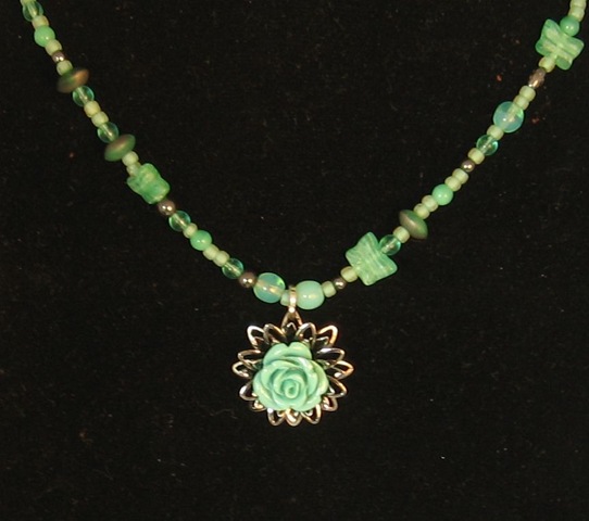 The next photo shows a simple strung necklace using glass beads. The easy pendant is made from a filigree piece to which I attached a small flower bead.