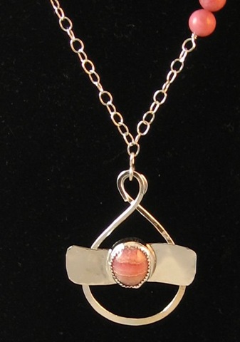 I recently had the fortunate experience of making some special jewelry as a gift. Although the request came from someone I do not know well, the gift was for someone I do know well. This made it much easier. The unique thing about this commissioned work was that the only parameters were to create something the recipient would like within the price range given. Since I know which pieces of my jewelry the person receiving the gift already has, I was able to make something she would not have seen before. It was also fortunate that the giver trusted me and there was no need to email preliminary photos back and forth. Below is a picture of the recipient wearing her new sterling silver and rodochrosite jewelry.