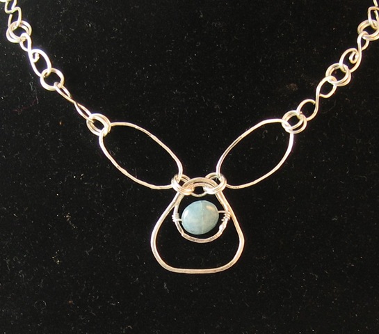 I also finished a much simpler sterling piece where I soldered a bezel to sheet metal and then soldered a small part of that metal to a wire armature. I purchased chain for this longer necklace.