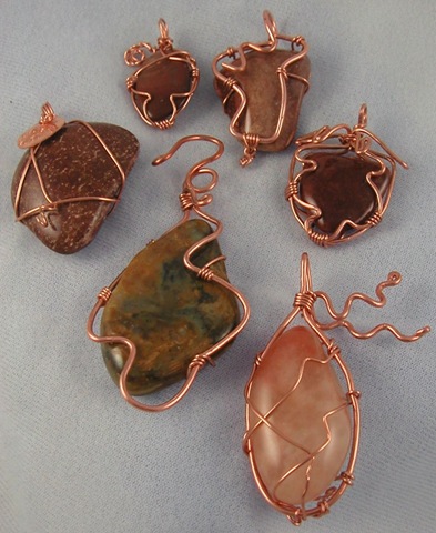 My friend Ralph has been bringing me rocks from Wildtype Ranch http://www.wildtyperanch.com/, near Cameron, TX for a year or so. He usually brings these tumbled treasures wrapped in a handkerchief and it’s fun to see what emerges. Originally, we thought I might use them as cabachons in bead embroidery, but the irregular shapes and curved backs have made that quite difficult. Finally, while cleaning the studio this past weekend, I rediscovered them and was determined to make them work for something. Some of the wire-wrapped results are shown in the picture. PICT0475 They have been a real challenge since traditional wraps have not worked for very many of the rocks. I’m hoping that after some buffing to remove the dings from my pliers Ralph’s Rocks will make nice pendants. Do you think I can call this is “freeform” wire wrapping? I’m currently working on a neck armature that these can be used to adorn (one rock at a time, of course).