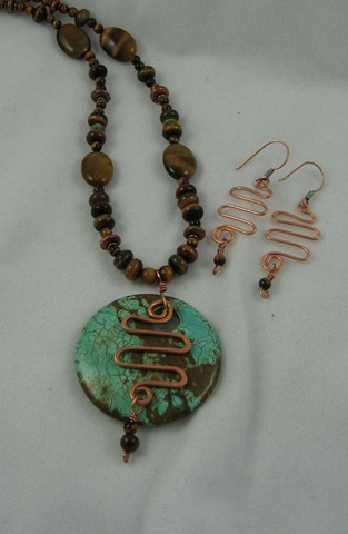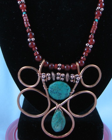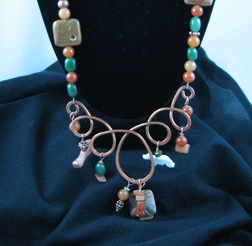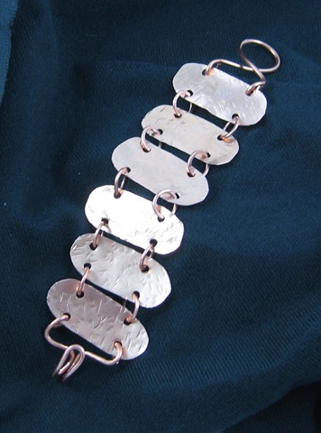 It’s copper and I elected to omit the patina. It definitely has bling! The ovals were cut from a sheet of 24 gauge copper and the rings are handmade from recycled copper wire. I made a second bracelet in the same style and did patina it. This is for a boutique owner who doesn’t like shiny (on her jewelry).