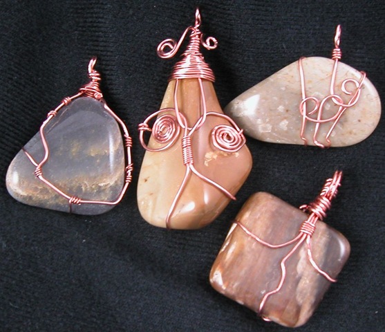 The last few blogs have been pretty solemn; therefore I can’t resist putting up the picture below. Late last night when I finished stringing several necklaces, a few moments of work time remained. The only thing immediately available was a group of small rocks and wire. Wrapping seemed appropriate.