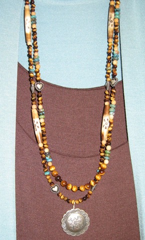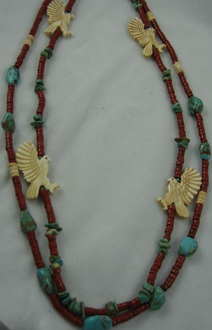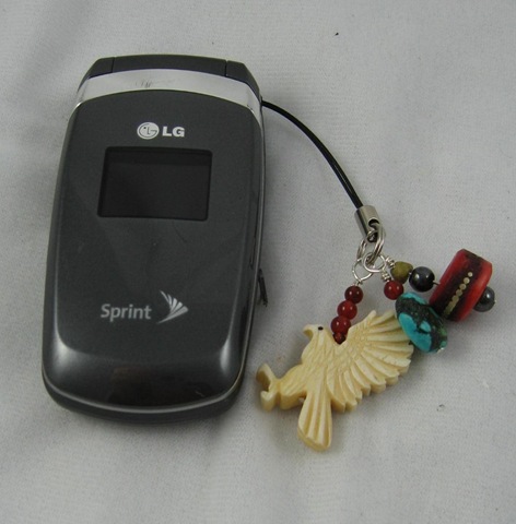 The jewelry pieces pictured today remind me of my Native American heritage. I regret that two of them are not better photos, but you will get the general sense of them. The brown piece is made of bone horn beads with tiger eye, turquoise and silver. It’s pictured hanging on a garment at Dovetails of Wimberley. There is also a picture of my new cell phone fob featuring a bone eagle. The second necklace has the same eagle beads. The other beads are jasper.