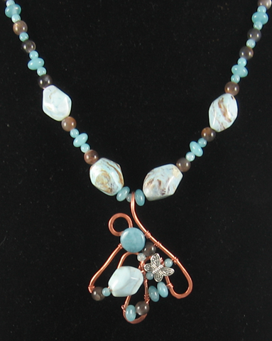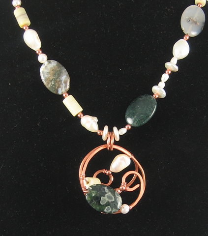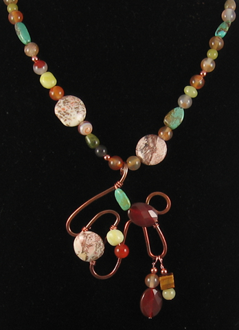 The fourth piece, composed of copper, pearls and amethyst is a prototype of pieces to come. I’m still playing with how to get the swinging swirls to hang just right. Watch for these again.