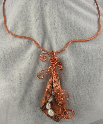 I used one larger copper pod filled only with wire tendrils and one brass pod filled with pearls and silver. We might call this the ANTI peas in a pod since the pods are not at all alike. I will continue to play with this idea of “anti” and see what develops. I believe there are many other possibilities if I continue to work with this idea.