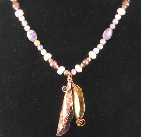 Several weeks ago, another designer who doesn’t do metal work requested that I make her a simpler and more realistic version of a plain pea pod. As I played with her order, I began creating various sizes of the newer pod using different metals including copper and brass both torched and not torched. Then I played with filling these pods with mixed metals or pearls. I also made baby pods in this newer shape and created earrings. Finally with too many pods on the work bench, I needed to do something with them. Having hung them on pearl strands, leather and neck wires, I kept thinking I should be more original. Yesterday, thinking again about the phrase and the number two, I tried mixing the pods.