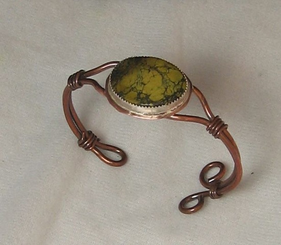 The second bracelet shown here is copper (I’m stretching to say copper is “down” from silver). I’ve been trying to develop a new bracelet that would incorporate a cabachon in a bezel. I think this might be a winner and will be especially nice when I get up the nerve to make it in sterling silver. This copper one retails at $30.