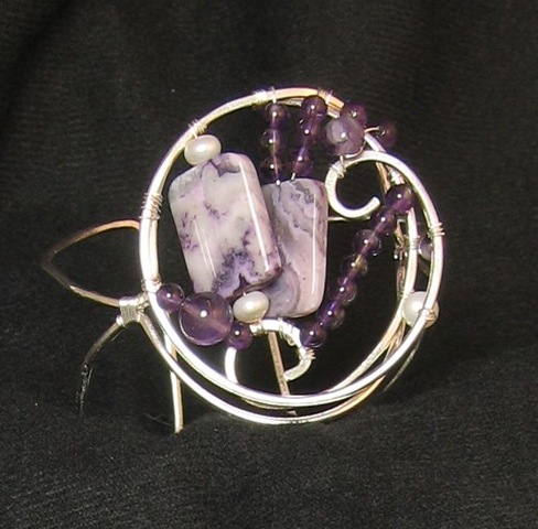 The photos of what I finished last night are more or less top down as well. This picture shows the very first sterling silver free form bracelet that I have made. I finally got the nerve to use this more expensive wire and managed not to mess it up. This is a dimensional cuff with amethyst, sugalite and pearls. I just put it in my etsy shop for $42 and we’ll see how it goes. http://www.etsy.com/listing/52292709/sterling-silver-gemstone-bracelet